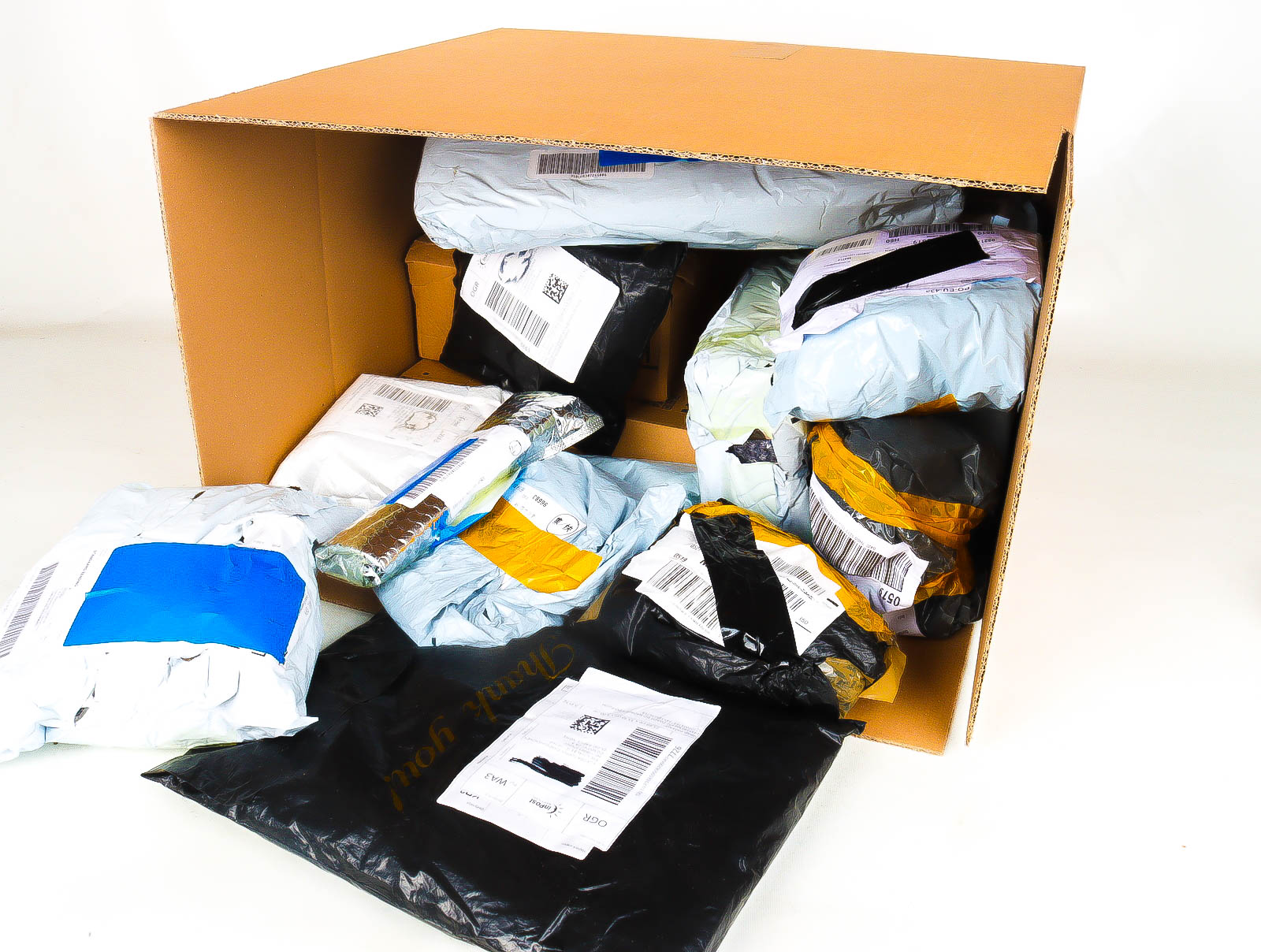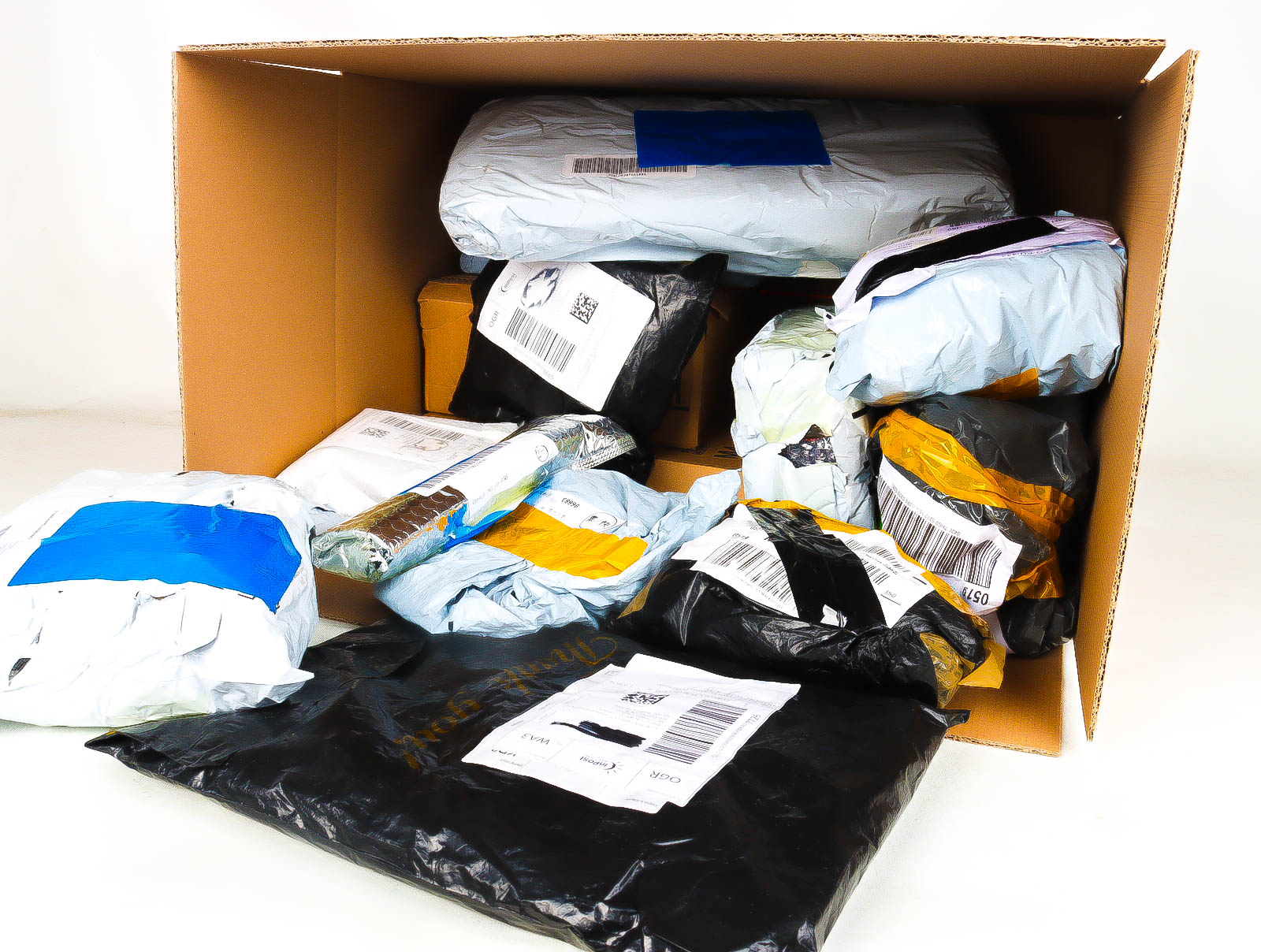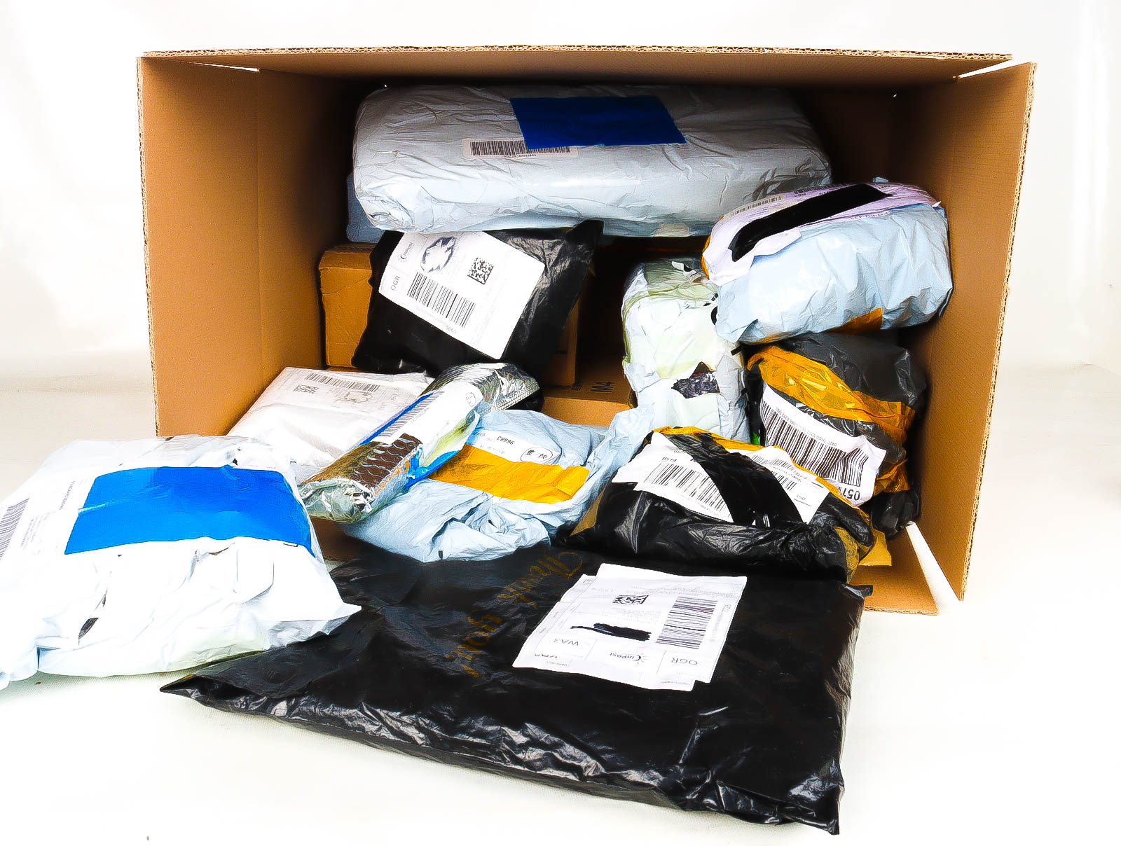 Deze pakketten zijn afkomstig van online retailers. De artikelen zijn binnen de zichttermijn teruggestuurd of zijn niet geleverd vanwege foutieve adressen, retourzendingen, of andere redenen.
